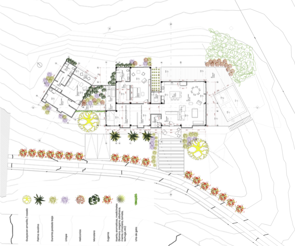 - Rightmost building: Social area with open concept Kitchen, dining, and living rooms, social bathroom, pantry, and entry